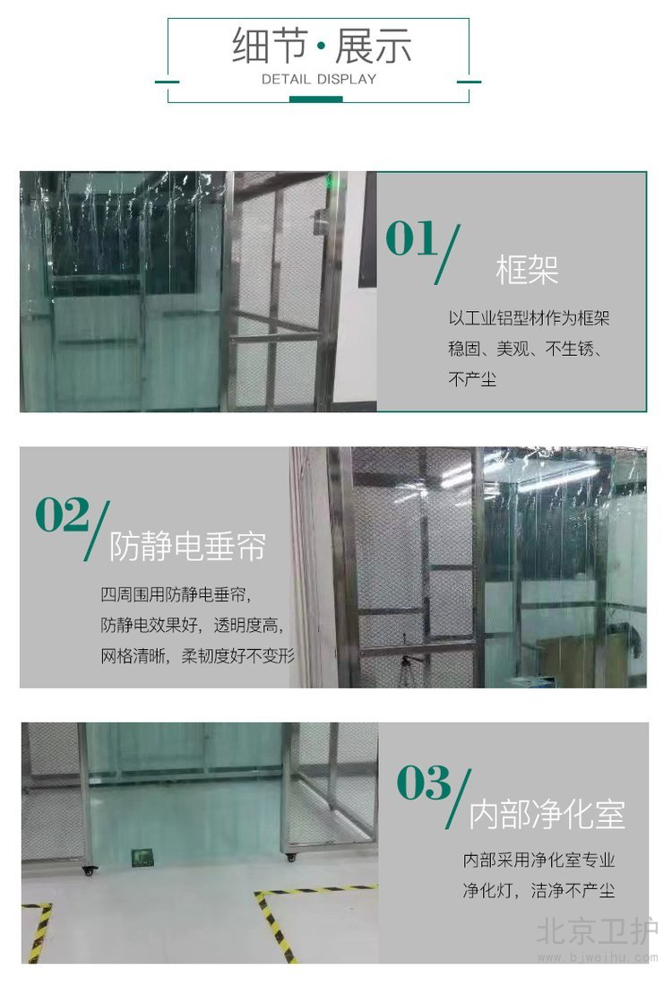 潔凈工作棚(簡稱:潔凈棚)(CLEAN BOOTH)是為快速方便建立的一座簡易潔凈室,潔凈棚具備多種潔凈等級及空間搭配可以根據(jù)使用需求設(shè)計制作,因此其簡便運用彈性大安裝容易且施工期短以及可移性為其主要特點,潔凈工作棚同時可針對在一般等級的潔凈室中局部地區(qū)需要高潔凈度的地方做局部增設(shè)以降低成本。潔凈工作棚是一種可提供局部高潔凈環(huán)境的空氣凈化設(shè)備。潔凈棚主要由箱體、風(fēng)機、初效空氣過濾器、阻尼層、燈具等組成,外殼噴塑。該產(chǎn)品既可懸掛,又可地面支撐,結(jié)構(gòu)緊湊,使用方便??梢詥蝹€使用,也可多個連接組成帶狀潔凈區(qū)域。